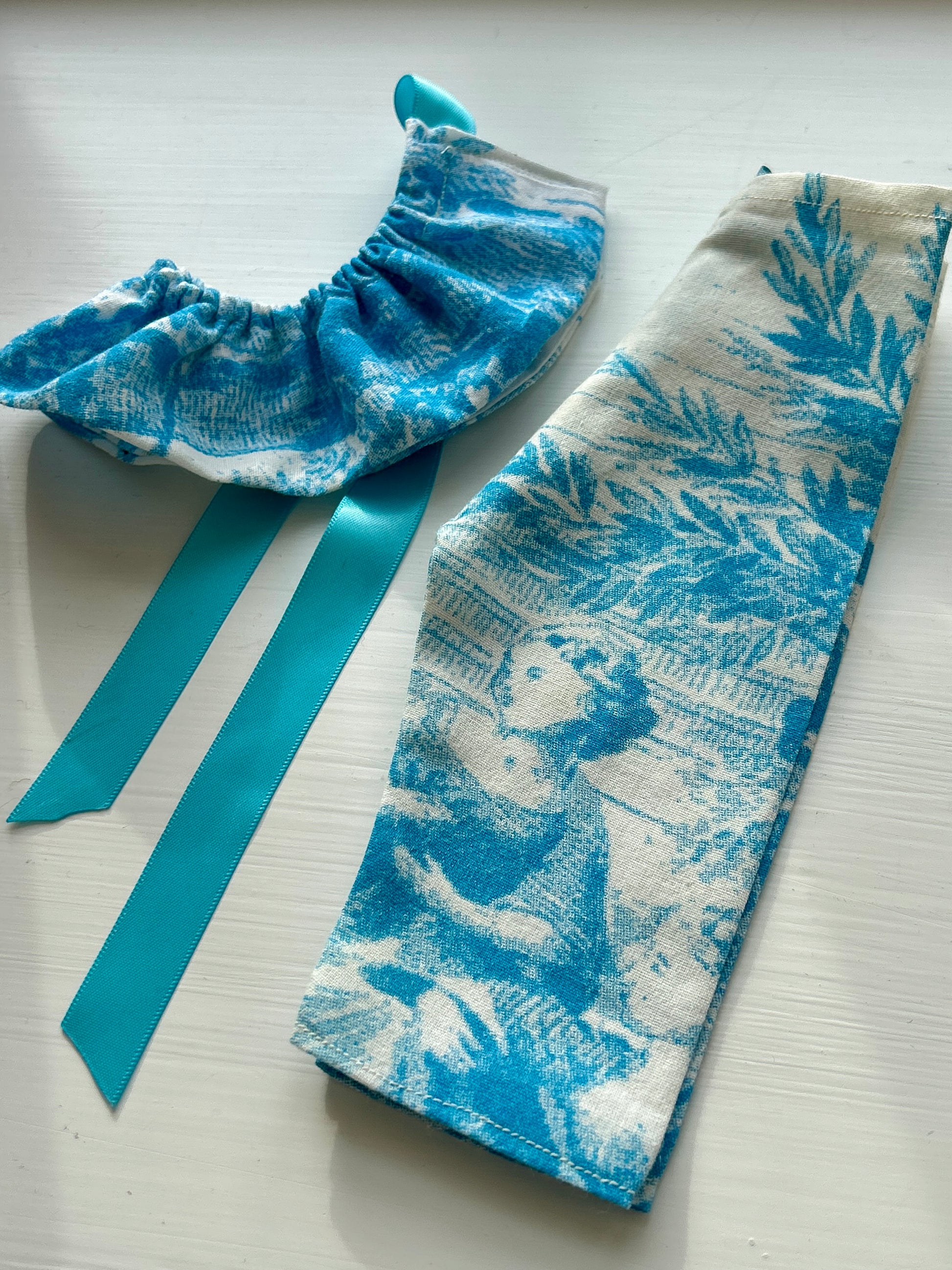 She comes with a outfit of trousers and ruffle collar in a 100% cotton French country fabric with ribbon ties.